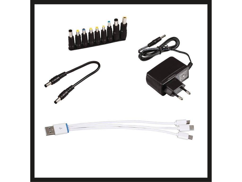 Eine weitere nützliche Funktion dieser kleinen Energiestation bietet die integrierte LED Arbeitsleuchte mit Dauerlicht, Stroboskop-Blitzer & SOS-Signal für verschiedene Notfall-Situationen. Um als mobile Energiestation verschiedenste Stromverbraucher schnell zu laden, sind ein 5V / 2A USB-Anschluss, ein Speed Charging Anschluss, ein 12V / 10A - Verbraucheranschluss (für z.B. Autokompressor) sowie ein 19V / 3,5A - Anschluss (für z.B. Notebook/Laptop) verfügbar. Im Lieferumfang befinden sich zudem ein Starthilfekabel mit vollisolierten Polzangen und Überlastschutz zum Anschluss an das Power Pack, ein USB-Adapterkabel, ein Adapterkabel mit 9 verschiedenen Notebook Adaptern (passend für z.B. Dell, HP, IBM, Lenovo, Toshiba, Sony, Samsung, Acer, Asus, Fujitsu, NEC, ect.) sowie ein 230 V Lade-Netzteil. Um das Gerät samt Zubehör sicher und praktisch zu verstauen, wird eine Schutz- und Aufbewahrungstasche gleich mitgeliefert.