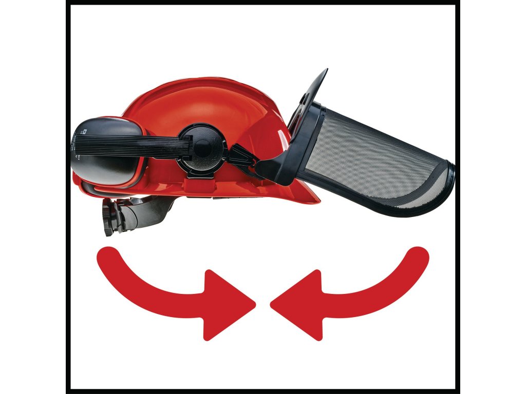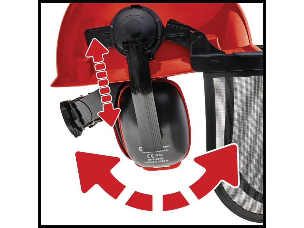 Das Nackenband kann komfortabel in der Länge verstellt werden. Das Kopfband ist per Einhandsystem für nahezu jeden Kopfumfang zwischen 52 und 66 cm optimal anpassbar. Der flexible Gesichtsschutz ist klappbar und verstellbar und bei gesicherten Arbeitsschritten auch abnehmbar. Zum Schutz der Ohren und des Hörvermögens, ist der Hörschutz drehbar, klappbar und in der Höhe stufenlos verstellbar. Dank seines besonders leichten Gewichts von 0,7 kg ermöglicht der Helm beschwerdefreies Arbeiten – auch über längere Zeit hinweg.