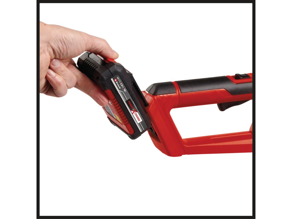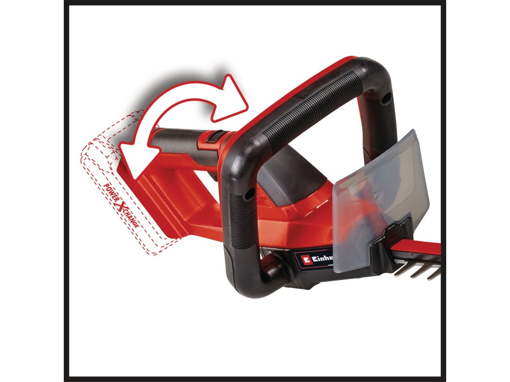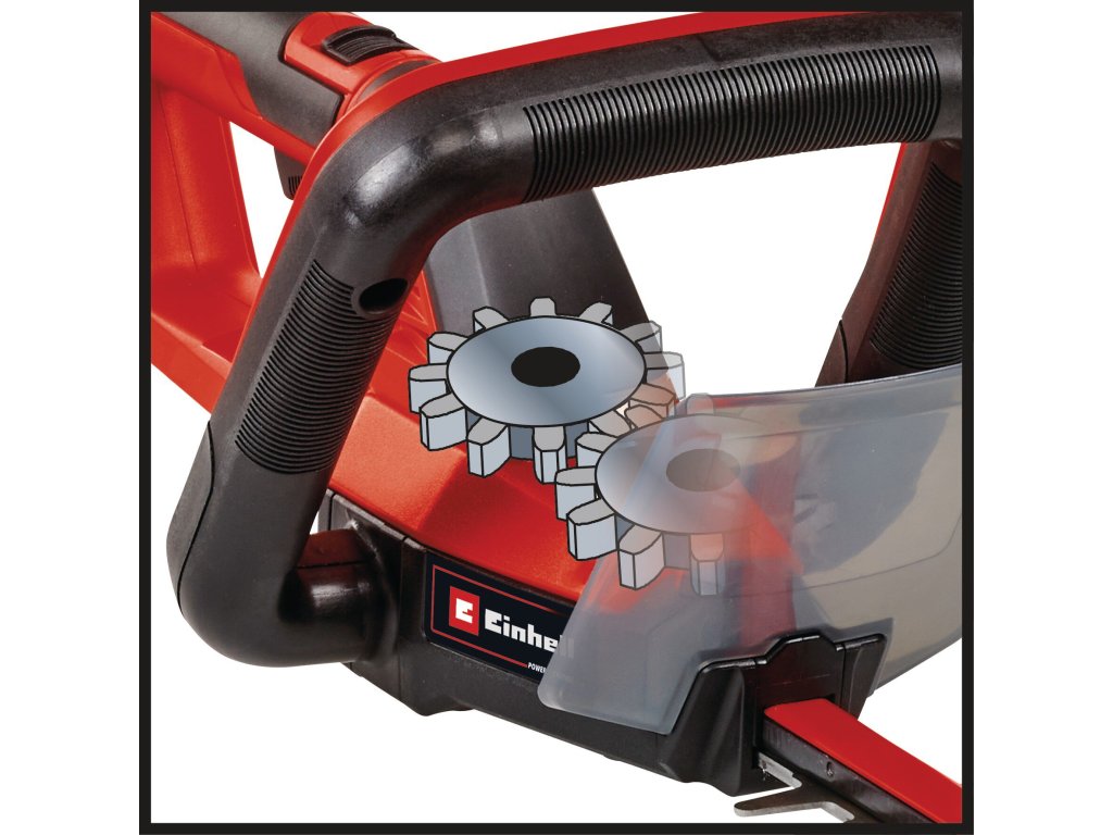 Die Einhell Akku-Heckenschere GC-CH 18/50 Li Solo vereint Power und Flexibilität: Als Mitglied der Power X-Change-Familie von Einhell wird die Heckenschere durch einen der kraftvollen Lithium Ionen-Akkus der Serie angetrieben. Die kleine, handliche Heckenschere ist ein wahres „Leichtgewicht“ und durch das geringe Gewicht komfortabel in der Handhabung. Dank des drehbaren hinteren Handgriffs und des großen Frontgriffs können auch zeitintensive und umfangreiche Heckenschnitte ermüdungsarm durchgeführt werden. Das robuste Metallgetriebe ist auf eine lange Lebensdauer ausgelegt und sorgt für die perfekte Umsetzung der Akku-Power auf die lasergeschnittenen und diamantgeschliffenen Stahl-Messer. Ein 2-Hand-Sicherheitsschalter schützt den Anwender während des Betriebs. Im Lieferumfang enthalten ist eine Alu-Messerabdeckung zum Schutz der Messer sowie ein Stoßschutz mit Halterung für die Wandmontage und ein stabiler Köcher für Lagerung und Transport. Die Akkus der hochwertigen Power X-Change-Reihe sind grenzenlos mit allen Systemgeräten kombinierbar. Für den Betrieb der Akku-Heckenschere ist 1x 18V-Akku notwendig. Die Lieferung erfolgt ohne Akku und Ladegerät, diese sind separat erhältlich, zum Beispiel als praktisches Starter-Set in verschiedenen Größen.