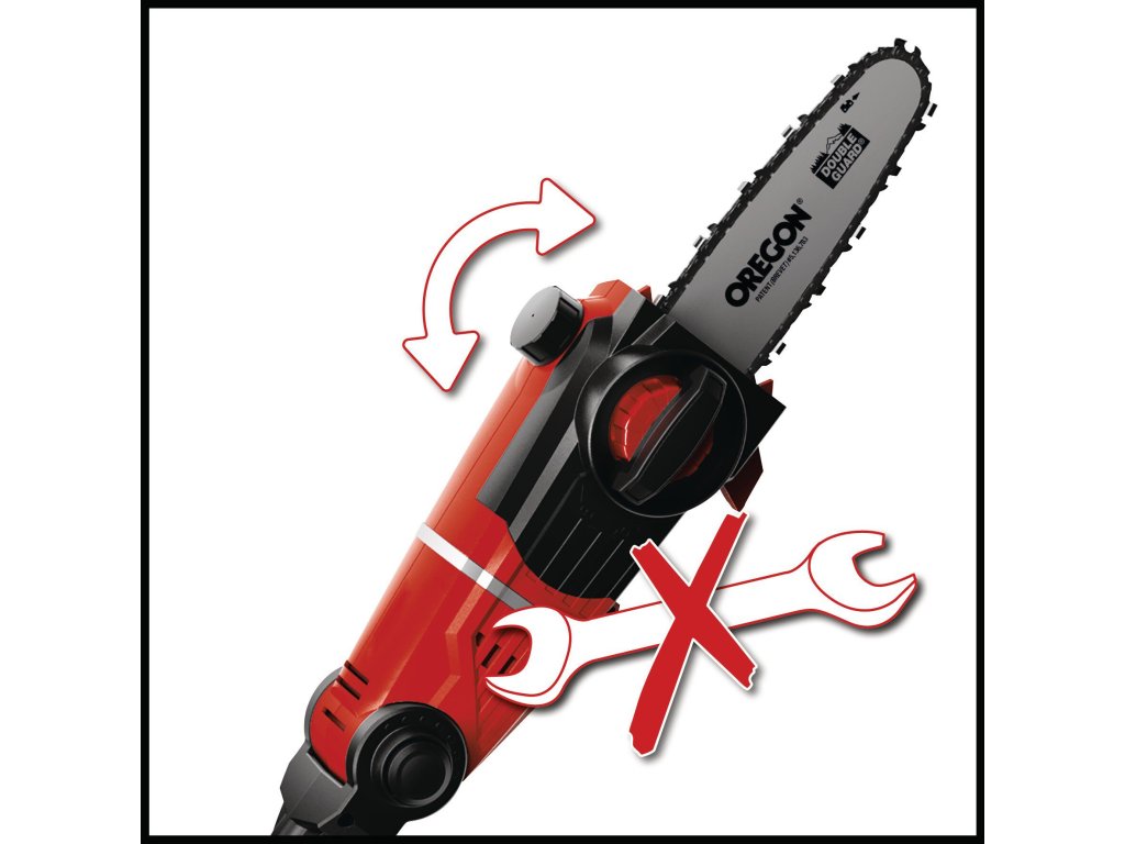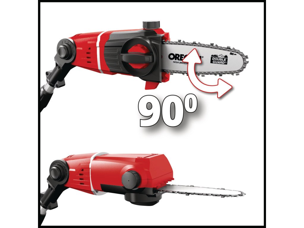 Das Akku-Multifunktionswerkzeug GE-HC 18 Li T ist ein leistungsstarkes Gerät, mit dem sich höher gelegene Äste und hohe Hecken mühelos und stromnetzunabhängig vom Boden aus beschneiden lassen. Dabei sorgt das Metallgetriebe für hohe Langlebigkeit und das OREGON-Qualitätsschwert und die OREGON-Kette für saubere Schnittresultate. Der um 90° drehbare Aufsatz sorgt dabei für mühelose Horizontalschnitte. Der Krallenanschlag verhindert dabei ein Abrutschen beim Sägen.