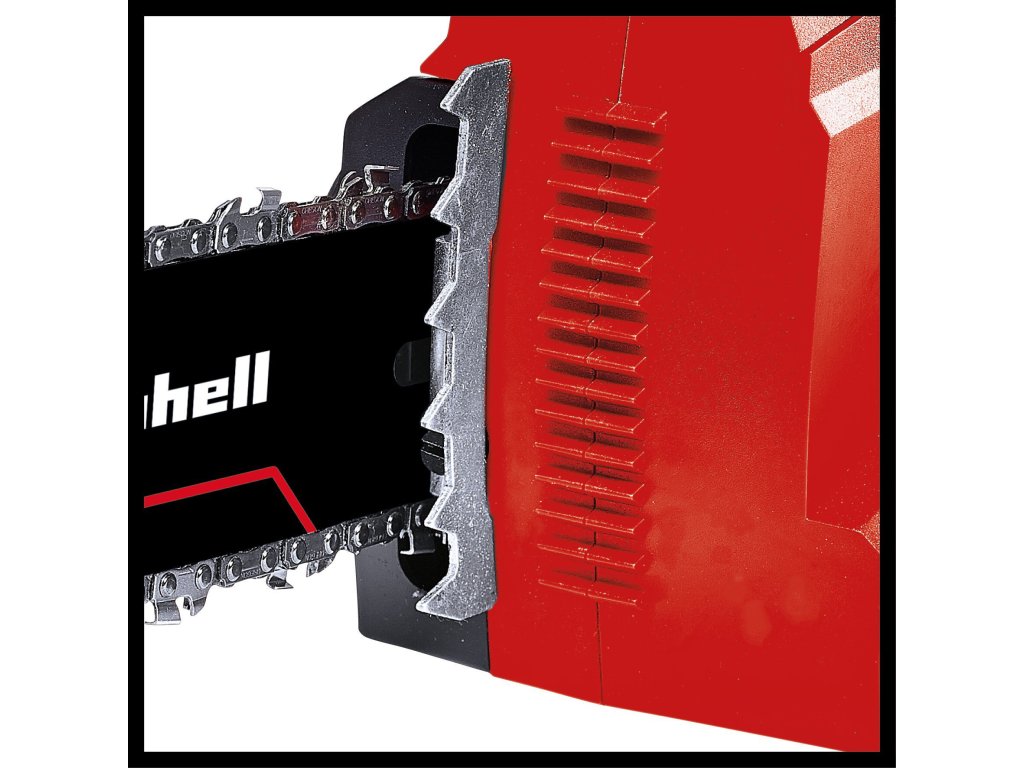 Die Kettensäge mit 23 cm Schnittlänge ist mit einer hochwertigen Kette mit 1,1 mm Treibgliedstärke, 40 Treibgliedern und 3/8" Kettenteilung ausgestattet. Für die optimale Sicherheit des Benutzers sorgt der Rückschlagschutz mit mechanischer Sofort-Kettenbremse. Dieser aktiviert sich unmittelbar beim Hochschlagen der Säge, sodass die Kette augenblicklich angehalten wird. Ein Kettenfangbolzen fängt die Kette ab, falls diese abspringt. Der robuste Krallenanschlag aus Metall sorgt für sichere und bequeme Führung bei allen Arbeiten, zusätzlich bietet der ergonomische Griff der Akku-Kettensäge von Einhell einen festen und angenehmen Halt. Die Kettenspannung lässt sich ganz ohne Werkzeug einstellen, und auch für den Kettenwechsel wird kein Werkzeug benötigt.
