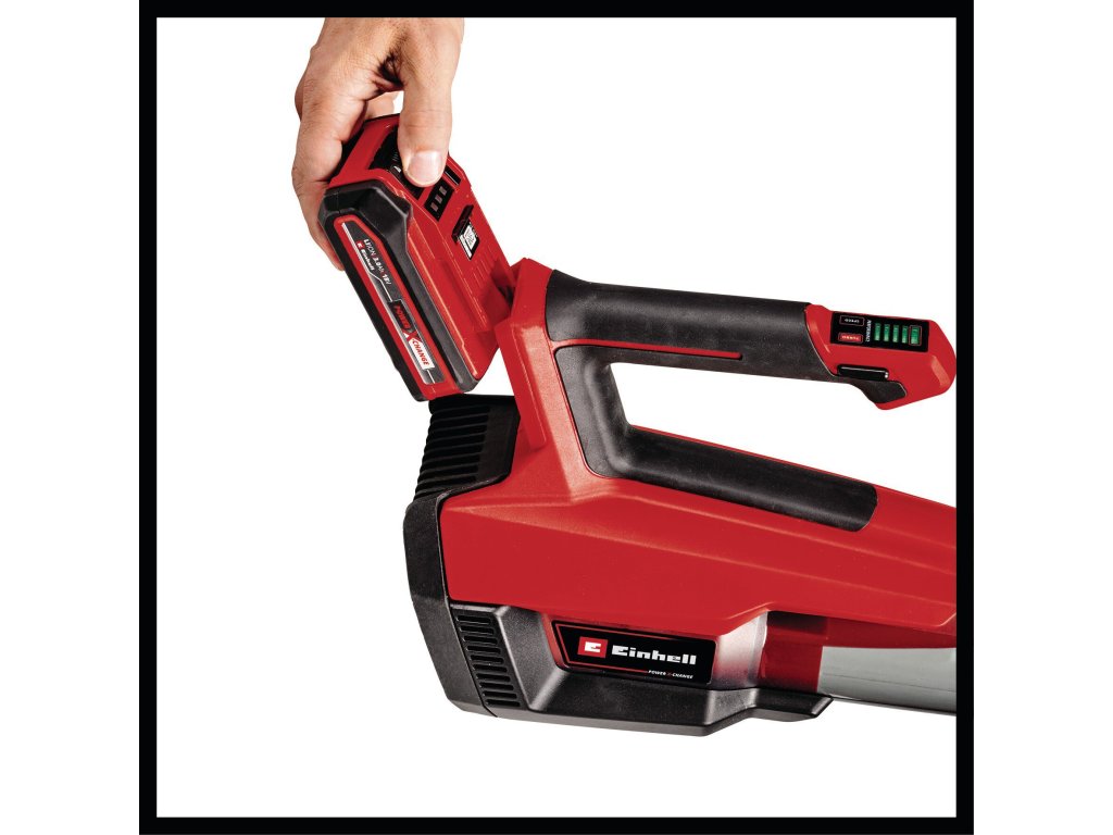 Der Einhell Professional Akku-Laubbläser GP-LB 18/200 Li E-Solo ist ein bewährter Helfer rund um das Gebäude, vor allem beim Großreinemachen im Frühling und Herbst. Als Mitglied der Power X-Change-Familie können alle Akkus der Systemreihe mit dem Laubbläser kombiniert werden. Für den Betrieb ist 1x 18 Volt-Akku nötig; Die Lieferung erfolgt ohne Akku und Ladegerät, diese sind separat erhältlich, zum Beispiel als praktisches Starter-Set. Für die optimale Performance wird ein 3,0 Ah PXC-Akku und größer empfohlen. Der Akku-Laubbläser ist gegenüber dem Artverwandten mit Benzinmotoren beträchtlich leiser und durch das geringere Gewicht einfacher zu handhaben. Der Balance-Handgriff mit Softgrip gewährt ein ergonomisches Arbeiten für eine besonders komfortable Handhabung.Angetrieben wird das Gerät von dem Einhell PurePOWER Brushless Motor. Dieser bürstenlose Motor bietet mehr Kraft und eine längere Laufzeit als herkömmliche Kohlebürsten-Motoren. Nach einer Online-Registrierung gelten 10 Jahre Garantie auf den Brushless-Motor. Die Axialgebläse-Technologie gewährt eine optimale Performance, und die maximale Blasleistung wird durch den Turboschalter aktiviert. Der robuste Metallring am Rohrende dient als Stoßschutz und garantiert lange Lebensdauer des Blasrohres. Die elektronische Drehzahlregulierung ist mit einer praktischen, mehrstufigen LED-Anzeige ausgerüstet. Das abnehmbare Blasrohr ist werkzeuglos montierbar. Für die einfache, platzsparende Aufbewahrung verfügt der Akku-Laubbläser über eine integrierte Wandhalterung.