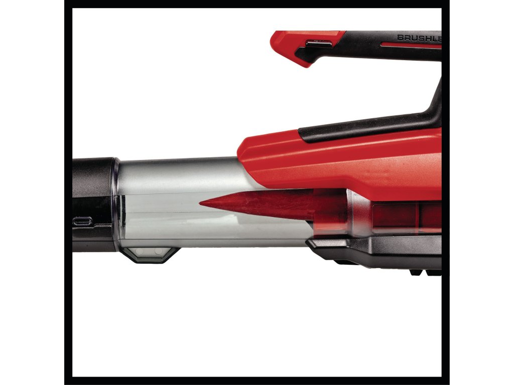 Die Lieferung erfolgt ohne Akku und Ladegerät, diese sind separat erhältlich, zum Beispiel als praktisches Starter-Set. Der Akku-Laubbläser ist gegenüber dem Artverwandten mit Benzinmotoren beträchtlich leiser und durch das geringere Gewicht einfacher zu handhaben. Der Balance-Handgriff mit Softgrip gewährt ein ergonomisches Arbeiten für eine besonders komfortable Handhabung. Angetrieben wird das Gerät von dem Einhell PurePOWER Brushless Motor. Dieser bürstenlose Motor bietet mehr Kraft und eine längere Laufzeit als herkömmliche Kohlebürsten-Motoren. Nach einer Online-Registrierung gelten 10 Jahre Garantie auf den Brushless-Motor. Die maximale Blasleistung wird durch den Turboschalter aktiviert. Der robuste Metallring am Rohrende dient als Stoßschutz und garantiert lange Lebensdauer des Blasrohres. Die elektronische Drehzahlregulierung ist mit einer praktischen, mehrstufigen LED-Anzeige ausgerüstet. Das abnehmbare Blasrohr ist werkzeuglos montierbar. Für die einfache, platzsparende Aufbewahrung ist der Akku-Laubbläser mit einer integrierten Wandhalterung ausgerüstet.
