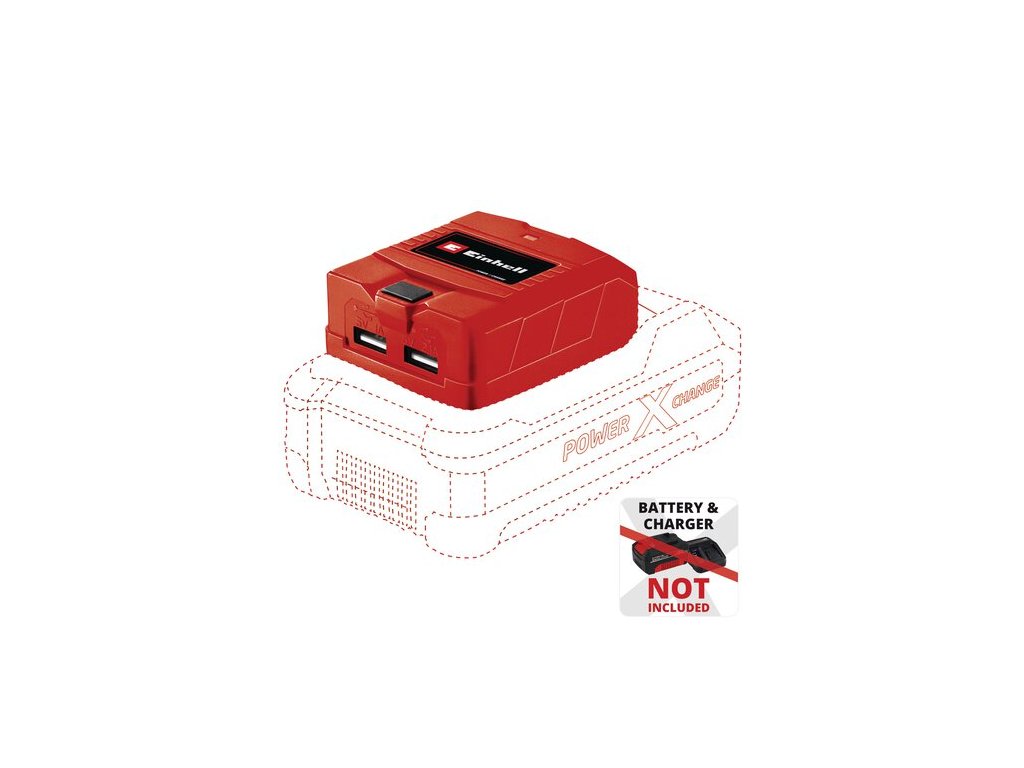 Der Einhell USB-Akku-Adapter TC-CP 18 Li USB-Solo ist eine praktische und mobile externe Stromquelle zum Laden von Handys, Tablets, MP3 Playern und vielen weiteren kleinen Stromverbrauchern, die unterwegs im Einsatz sind. Als Stromlieferant sorgt ein Systemakku aus der innovativen Power X-Change Familie für jederzeit genügend Leistung, um die Akkus leerer Verbrauchsprodukte wieder zu laden. Dank 2 USB-Anschlüssen am Gehäuse können gleichzeitig bis zu 2 Geräte geladen werden. Für einen schnellen Ladevorgang wird ein USB-Anschluss dabei mit einem starken 2,1 A Ladestrom versorgt. Die Ladezeit der einzelnen Geräte ist abhängig von der Akkukapazität des jeweilig angeschlossenen Gerätes. Die Lieferung erfolgt ohne Akku und Akku-Ladegerät als Ergänzung zu bereits vorhandenen Geräten der Power X-Change Familie von Einhell.