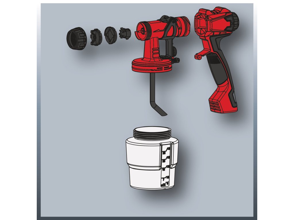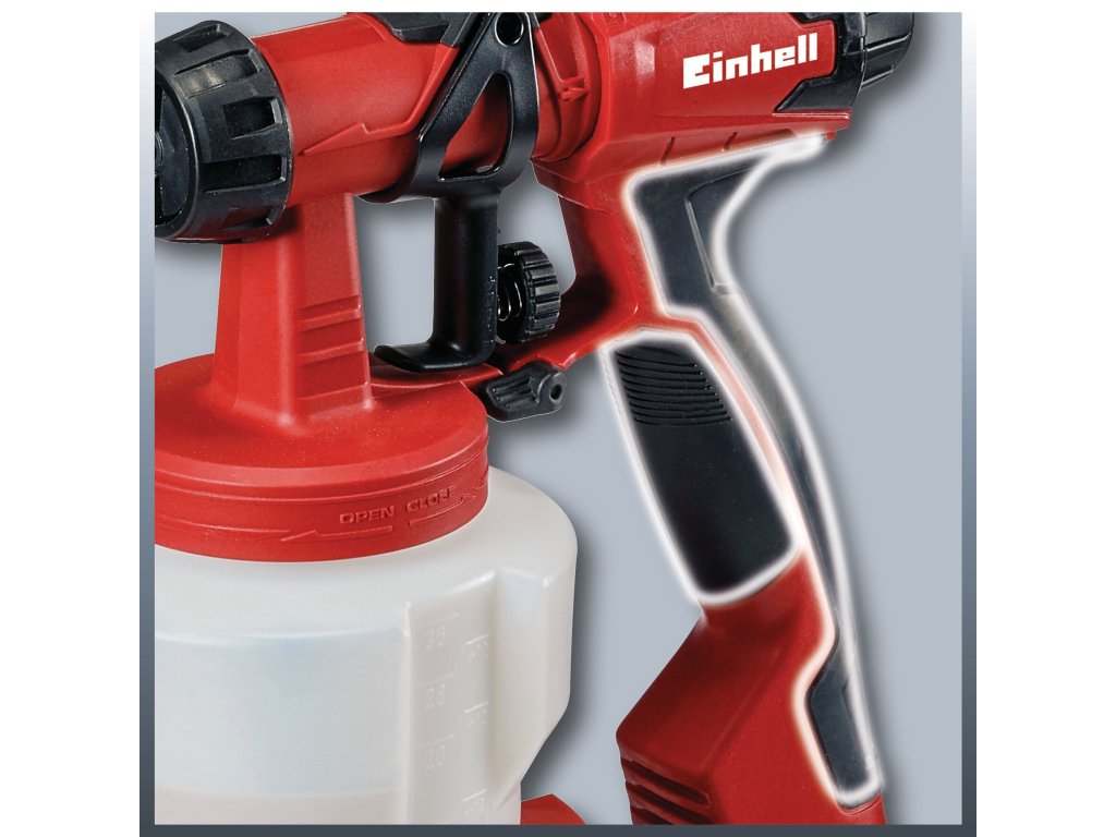 Durch den komfortablen Softgriff liegt der Farbsprüher sicher und angenehm in der Hand. Der integrierte Zugschlitten ermöglicht ein flexibles Arbeiten und eine praktische, platzsparende Schlauchaufbewahrung in einem. Im Lieferumfang enthalten sind zwei Düsen für unterschiedliche Lack-, Lasur- und Farbviskositäten, eine Reinigungsbürste zum Reinigen des Steigrohrs, eine Reinigungsnadel zum Säubern der Sprühdüse sowie ein Behälter zur Viskositätsprüfung, ein 1.000-ml-Farbbehälter und ein passgenauer Deckel.