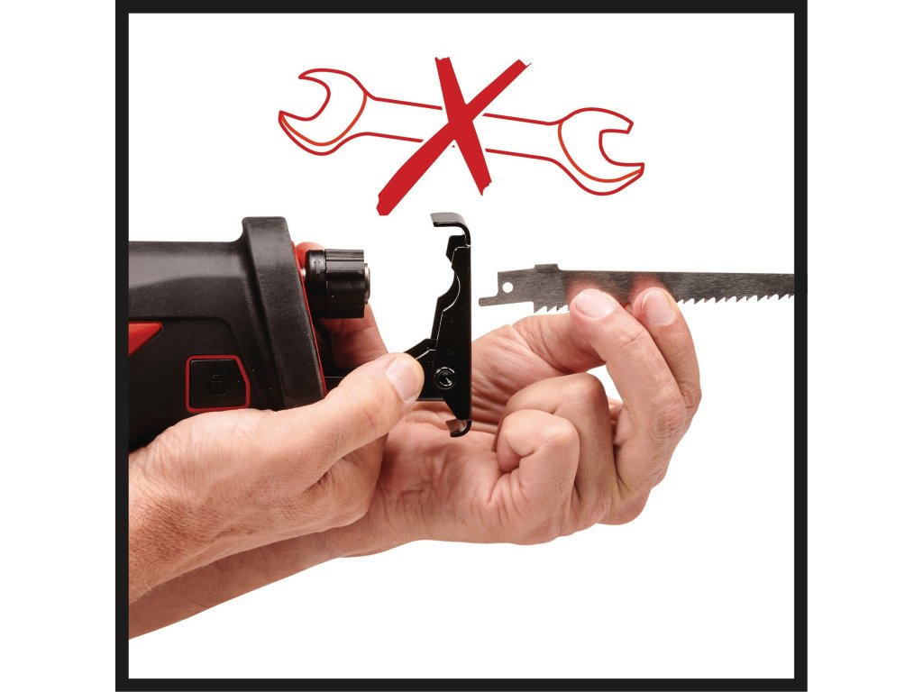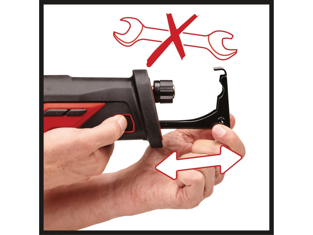Durch die Anti-Vibrations-Funktion sind auch längere Einsätze ergonomisch und angenehm zu bewältigen. Der Sägeschuh ist verstellbar, damit das Sägeblatt optimal ausgenutzt werden kann. Die Schnittiefe in Holz beträgt 180 mm, in Stahl bis zu 12 mm. Der Sägeblattwechsel erfolgt werkzeuglos, schnell und einfach. Ergonomisches Handling bieten die Softgripflächen. Zum Lieferumfang gehört ein Qualitäts-Sägeblatt für Holz, welches mit hervorragenden Schnitteigenschaften überzeugt. Akku und Ladegerät sind separat erhältlich, zum Beispiel als praktisches Einhell Starter-Set.