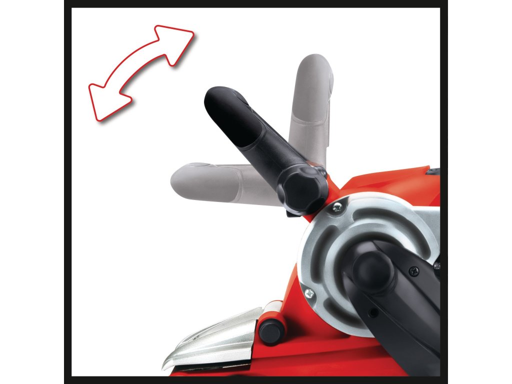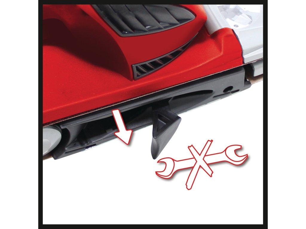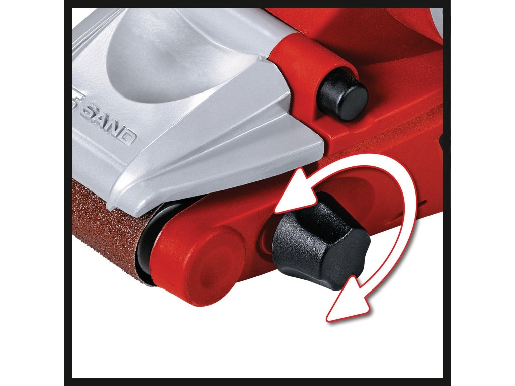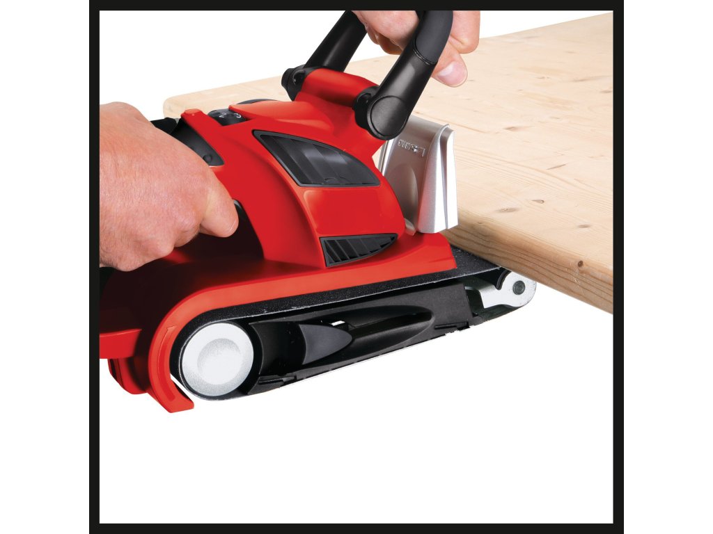 Der äußerst präzise Bandlauf lässt sich mittels Feinjustierung optimal einstellen, die Schleifbänder sind dank des Arretierhebels im Handumdrehen und werkzeuglos gewechselt. Der Softgrip und der ebenfalls werkzeuglos verstellbare Zusatzhandgriff des TE-BS 8540 E bieten hervorragende Ergonomie und hohen Bedienkomfort. Die Frontabdeckung lässt sich hochklappen, um auch randnahe Flächen bearbeiten zu können.