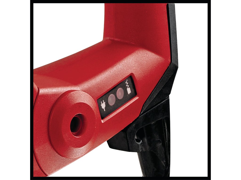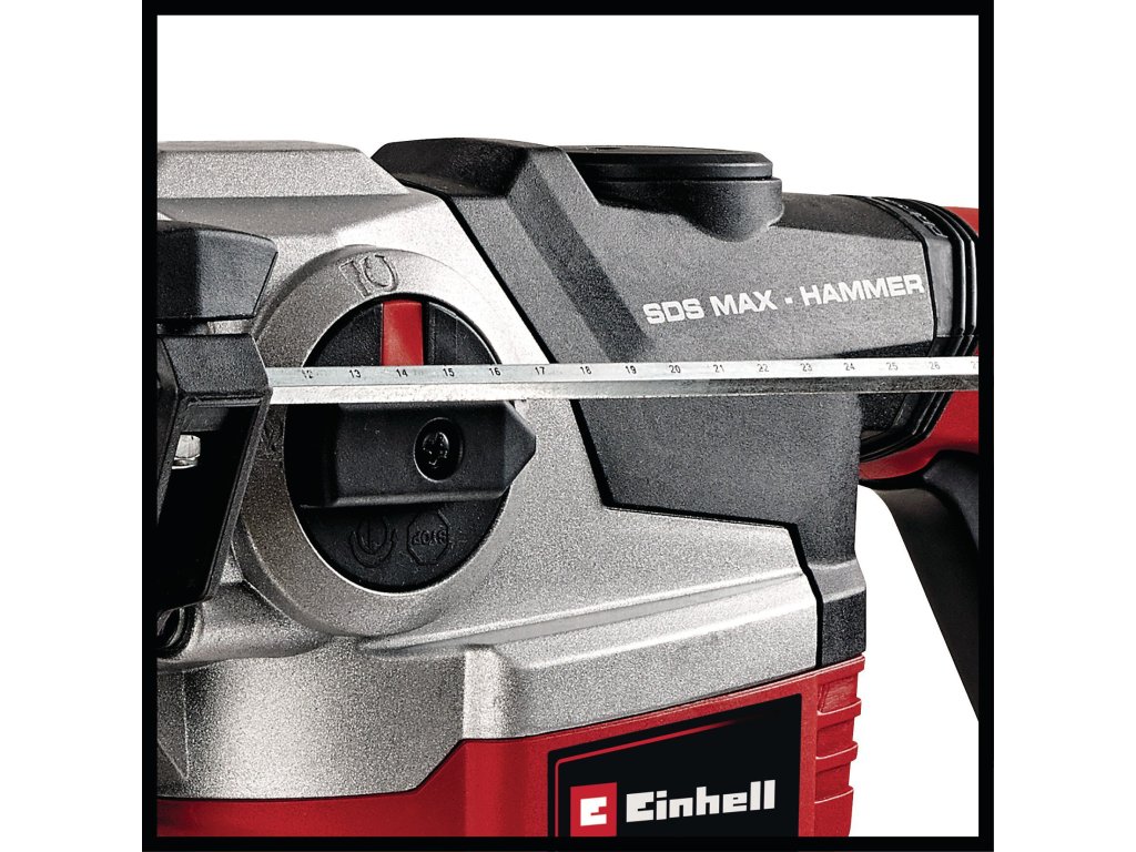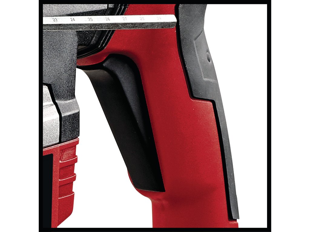 Der Hauptgriff des TE-RH 38 E Bohrhammers ist vibrationsgedämpft und signalisiert den optimalen Anpressdruck per „Press-control“ – eine wichtige Unterstützung für verschleißarmes und dennoch schnelles Arbeiten. Die zusätzlichen Softgriffeinlagen an den Handgriffen dämpfen zudem zuverlässig entstehende Schwingungen. Mittels Drehzahlelektronik lässt sich ganz einfach gefühlvoll und sanft anbohren. Der Aluminium-Getriebekopf des Bohrhammers ist robust aufgebaut. Der Zusatzhandgriff ist mittels Verrippung sicher gegen Verdrehen fixiert. Über zwei LEDs erhält man nicht nur Einsatzbereitschaft, sondern auch Servicebedarf aufgrund Bürstenverschleiß automatisch angezeigt. Für hohe Arbeitssicherheit sorgt eine Überlast-Rutschkupplung, die bei plötzlichem Bohrerklemmen sofort auslöst. Exakt wiederholbare Bohrtiefen gewährleistet der stufenlos verstellbare Bohrtiefenanschlag aus Metall. Der Bohrhammer lässt sich im Handumdrehen im praktischen Transport- und Aufbewahrungskoffer E-Box M55 verstauen.