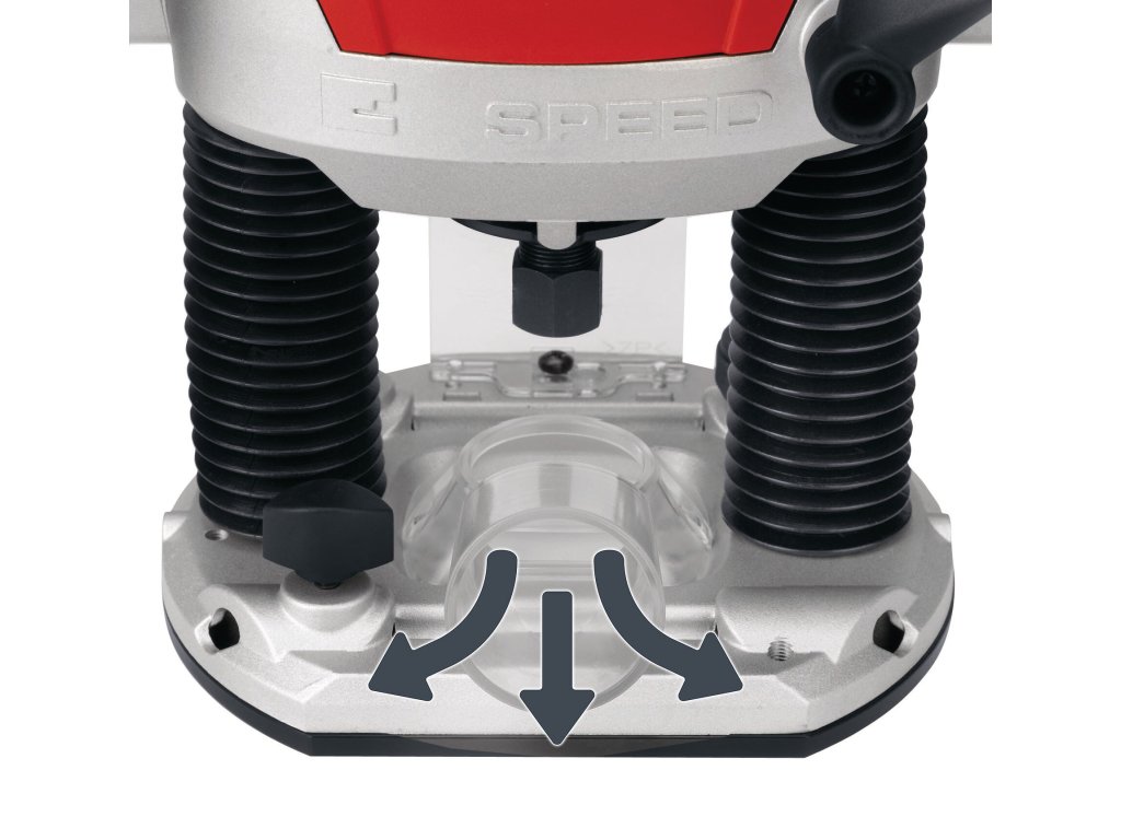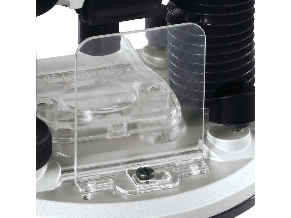 Die Spindelarretierung ermöglicht einen schnellen, mühelosen Werkzeugwechsel, wobei das ausgewogene Design für sicheren Stand des Gerätes sorgt. Die Spannzange schafft Flexibilität, indem sie die Verwendung von Werkzeugen mit einem Schaftdurchmesser von 6 mm oder 8 mm ermöglicht. Eine Kunststoffeinlage am Standfuß schont die Werkstückoberfläche. Dank ergonomischer Softgrip-Handgriffe liegt die Oberfräse angenehm und sicher in der Hand. Nach getaner Arbeit lässt sich die Zuleitung per Kabelclip fixieren, und das Gerät ist im Handumdrehen ordentlich verstaut. Zirkel, Parallelanschlag und Kopierhülse komplettieren den Lieferumfang der Oberfräse.