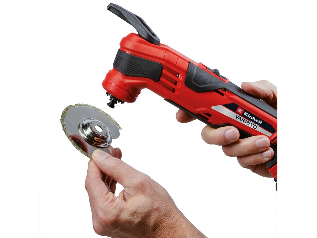 Das Einhell Akku-Multifunktionswerkzeug Varrito ist ein flexibler und hochwertiger Helfer bei Ausbau-, Renovierungs- oder Sanierungsarbeiten. Dank der umfangreichen Ausstattung gehen Arbeitsschritte wie Sägen, Schleifen oder Schaben mühelos von der Hand. Als Mitglied der Power X-Change-Familie stehen dem Anwender alle Vorteile der hochwertigen Lithium-Ionen-Technologie von Einhell offen. Das Akku-Multifunktionswerkzeug ist hochwertig und ergonomisch konzipiert, so dass die Anwendung in der Praxis eine enorme Erleichterung darstellt. So sorgt der Schnellspannverschluss für einen werkzeuglosen Zubehörwechsel. Dieser lässt sich dank der magnetischen Werkzeugaufnahme komfortabel und schnell vollziehen. Die 12-Pin-Werkzeugaufnahme ermöglicht eine flexible Positionierung des Zubehörs.