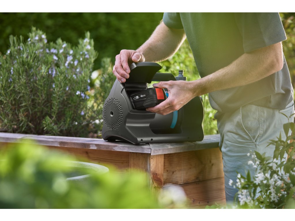 Die Akku-Gartenpumpe 3000 18 V P4A im Ready-To-Use Set von GARDENA ist eine leistungsstarke akkubetriebene Pumpe (Akku im Lieferumfang enthalten) – die flexibel überall im Garten platziert werden kann. Sie sorgt für eine zuverlässige Wasserversorgung unter Nutzung natürlicher Wasserressourcen.