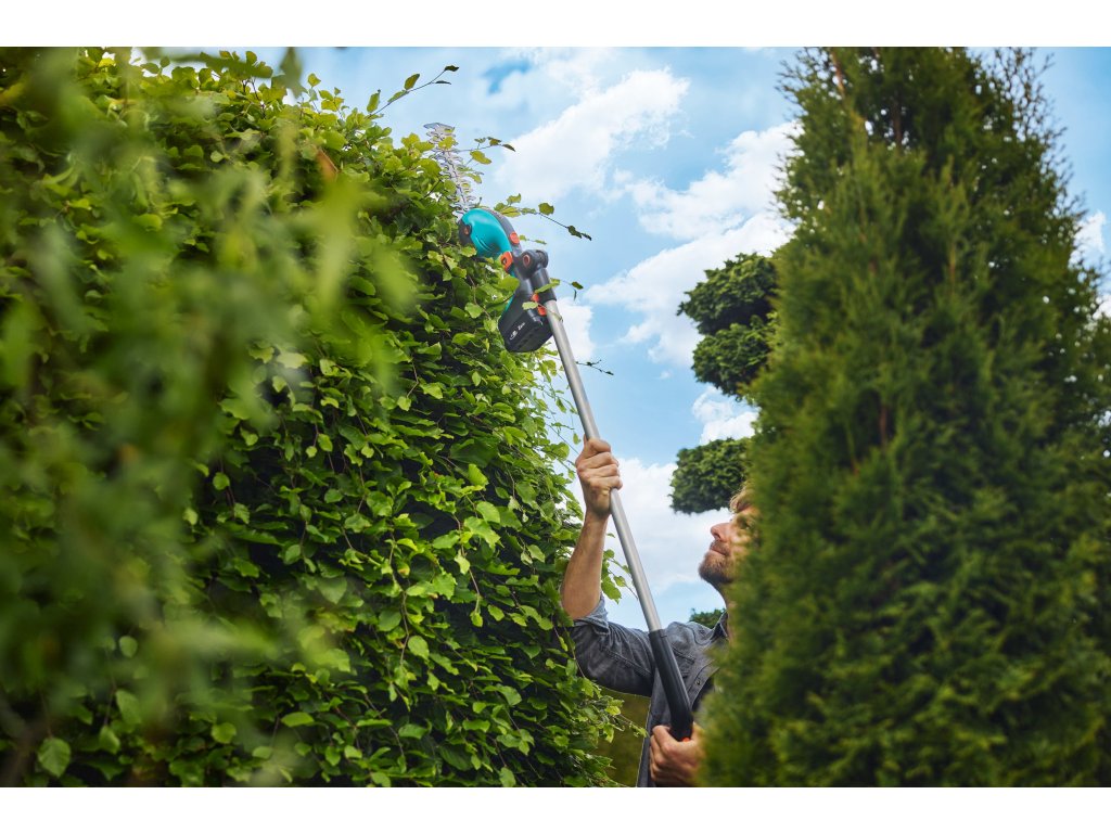 Der Stiel des Grasscheren-Sets PowerCut 18V solo ermöglicht das Trimmen des Rasens aus einer stehenden Position. Der schwenkbare Griff hilft zudem beim Erreichen höherer Hecken. Dies kann die körperliche Belastung und Ermüdung beim Schneiden deutlich reduzieren und die Gartenarbeit angenehmer machen.