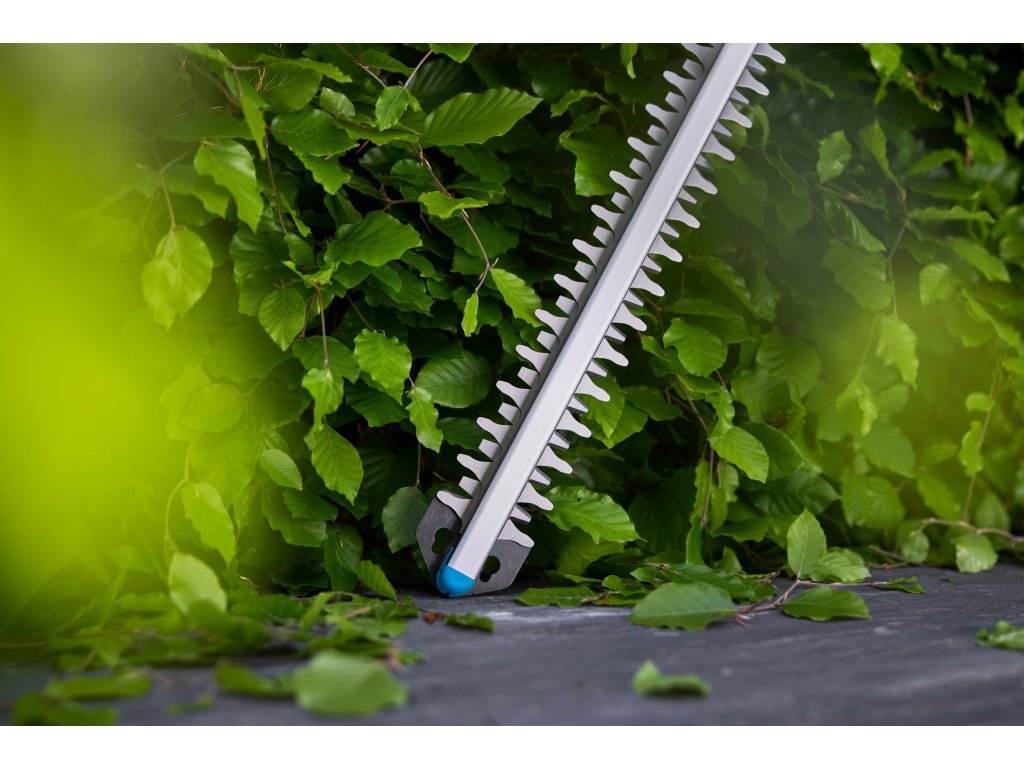 Die Heckenschere verfügt über einen speziell entwickelten ergonomischen Bügelgriff. Dadurch kann die kabellose Heckenschere in verschiedenen Positionen gehalten werden, was die Belastung und Ermüdung reduziert. Der Griff erleichtert zudem das Navigieren durch überwucherte Bereiche und hilft dabei, den idealen Schneidewinkel zu finden – sowohl bei geraden als auch bei geschwungenen Hecken