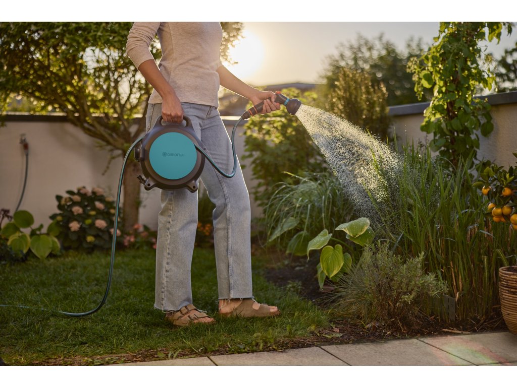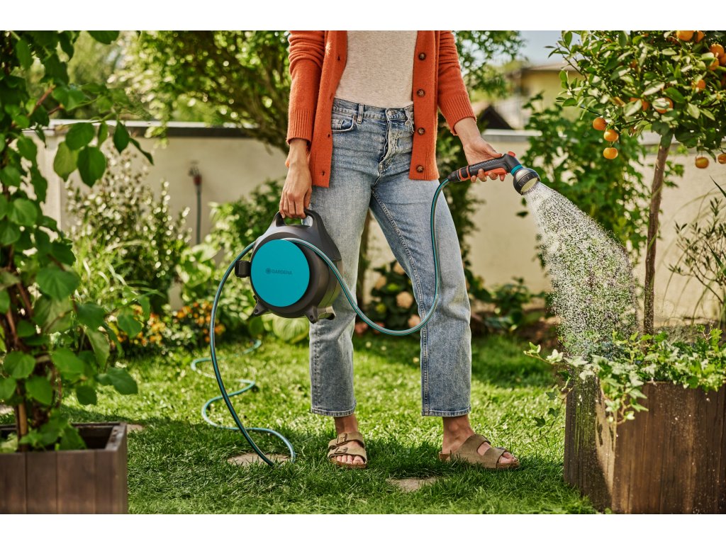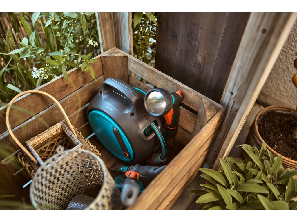 Die tragbare Schlauchbox Move wird mit allem geliefert, was Du zum Gießen brauchst. Im Lieferumfang enthalten sind eine Classic Bewässerungsspritze, ein Gerätehalterung und ein Hahnverbinder.