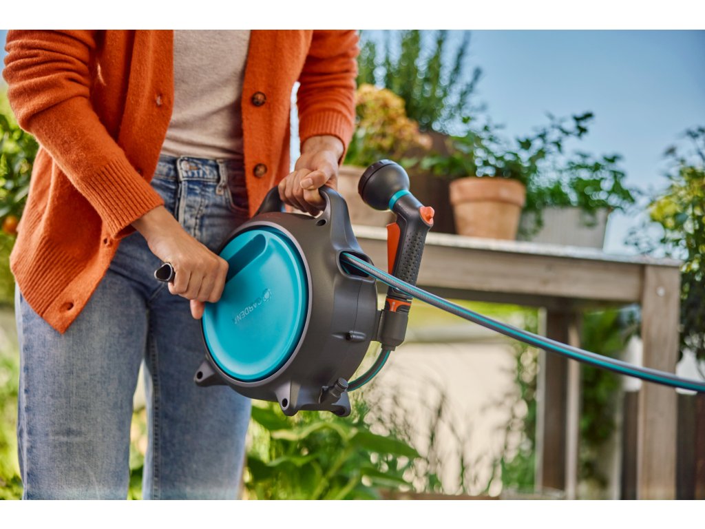 Klein, kompakt und handlich eignet sich die tragbare Schlauchbox Move mit komfortabler Schlauchaufrollung für Balkone, Terrassen und unterwegs.