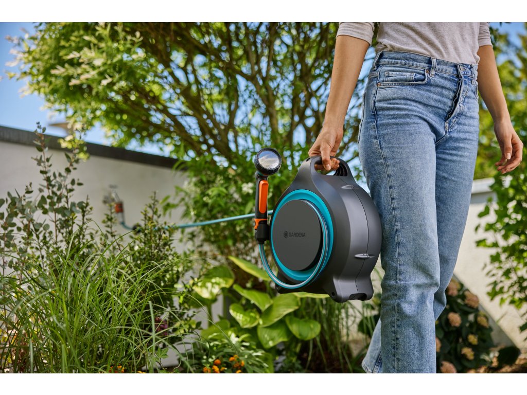Die tragbare Schlauchbox MoveMatic von GARDENA ist klein, kompakt und handlich. Mit automatischer Schlauchaufrollung, einem 12,5 m langen Anschlussschlauch und einem 1,5 m langen Zuführschlauch ist sie ideal für Balkone, Terrassen, kleine Gärten und unterwegs.