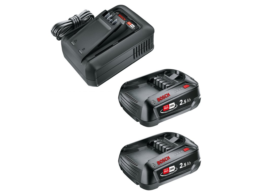 - Lieferumfang: Schnellladegerät AL 18V-44, 2 Akkus PBA 18 V 2,5 Ah SoC
