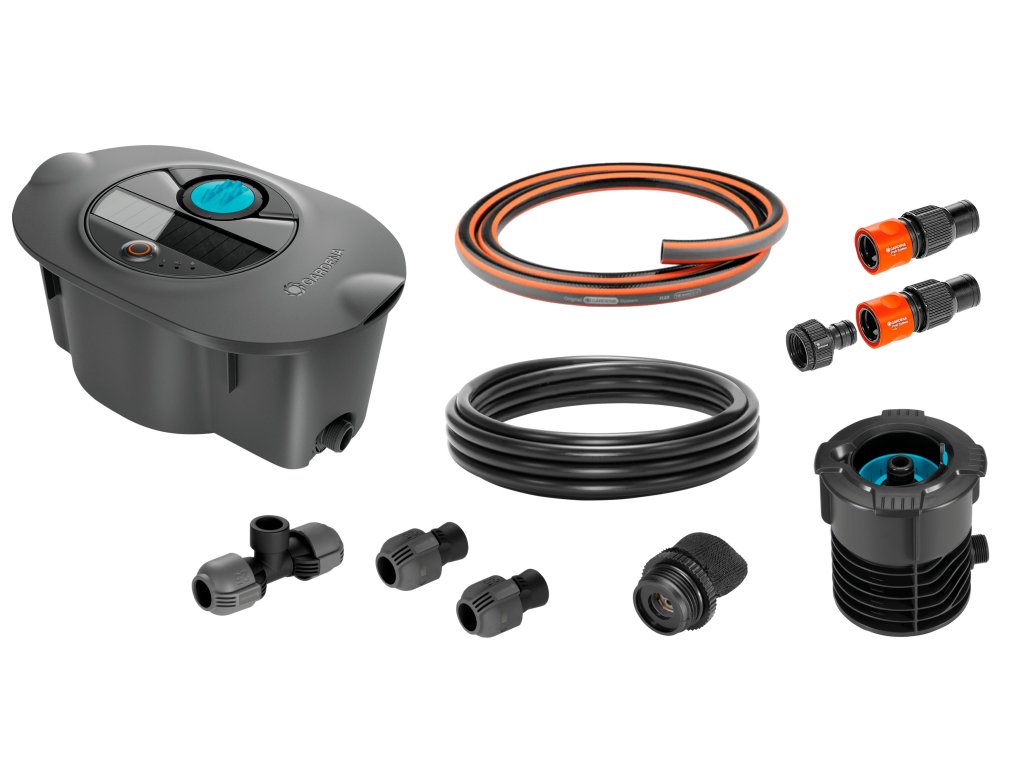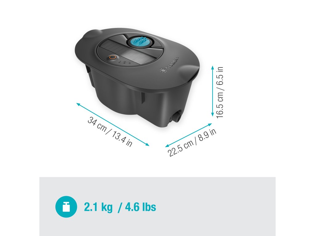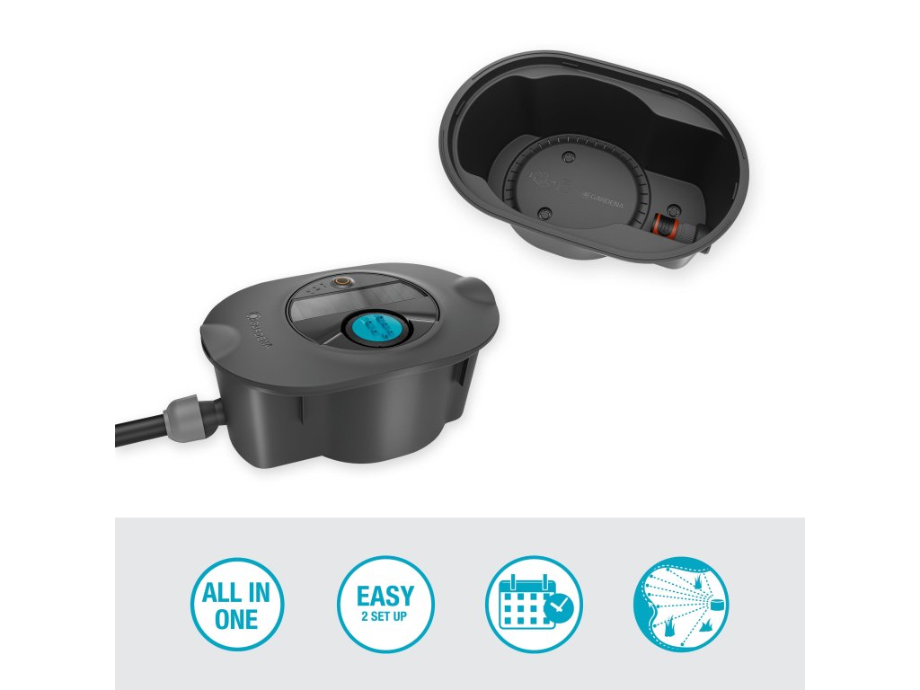 Der AquaPrecise umfasst eine Bewässerungssteuerung, ein Solarpanel, einen Kontur-Regnerkopf und ein FlowBalance-Ventil. Das unabhängige* Bewässerungssystem wird von einem Solarpanel mit Strom versorgt und sorgt für eine zuverlässige Bewässerung bei allen Wetterbedingungen. Wenn der Akku leer wird, kann er einfach über den USB-C-Anschluss aufgeladen werden. Das Bewässerungssystem wird mit einer unterirdischen Aufbewahrungsbox mit 3/4"-Außengewinde geliefert, das mit der GARDENA Pipeline kompatibel ist.